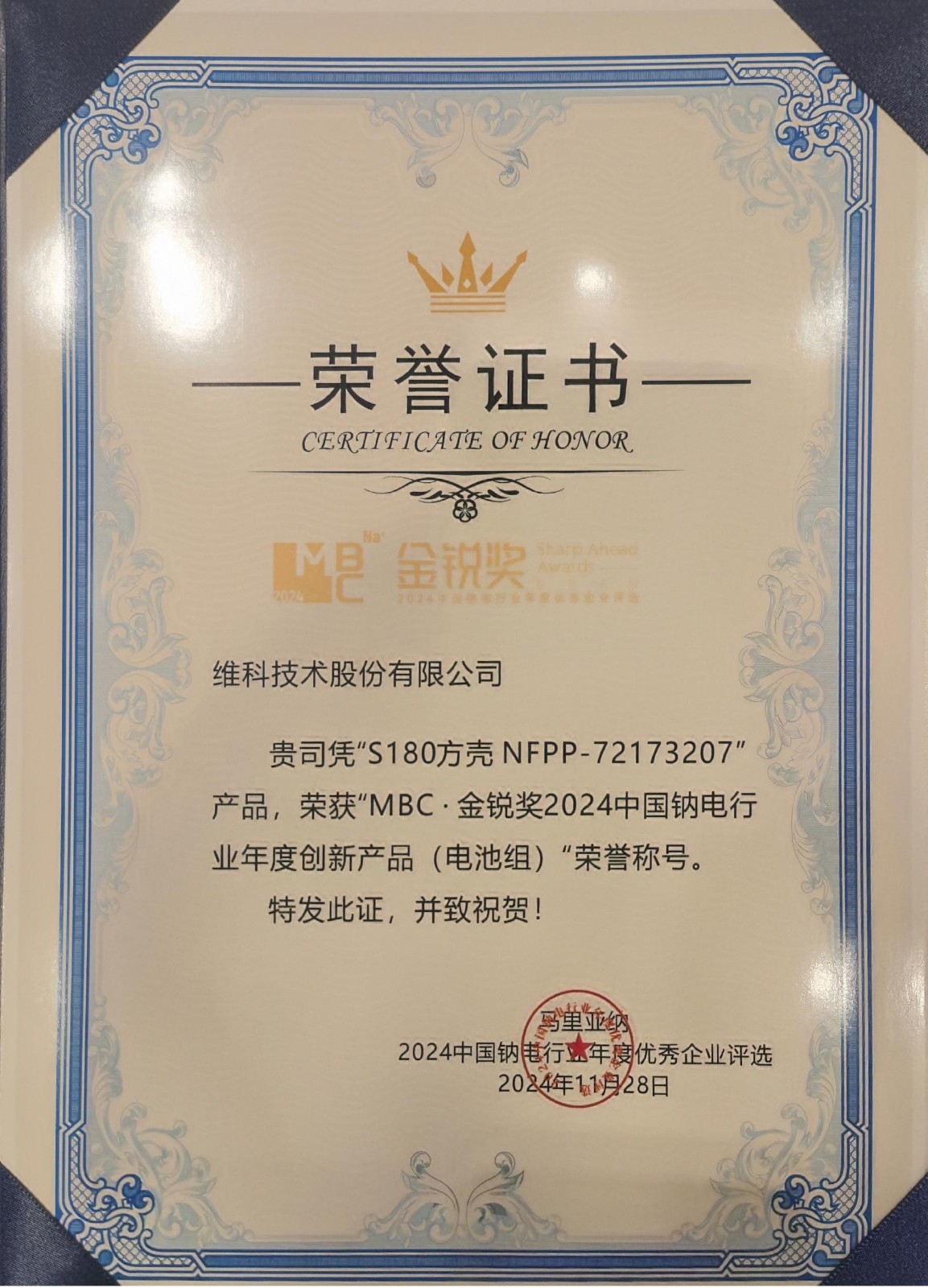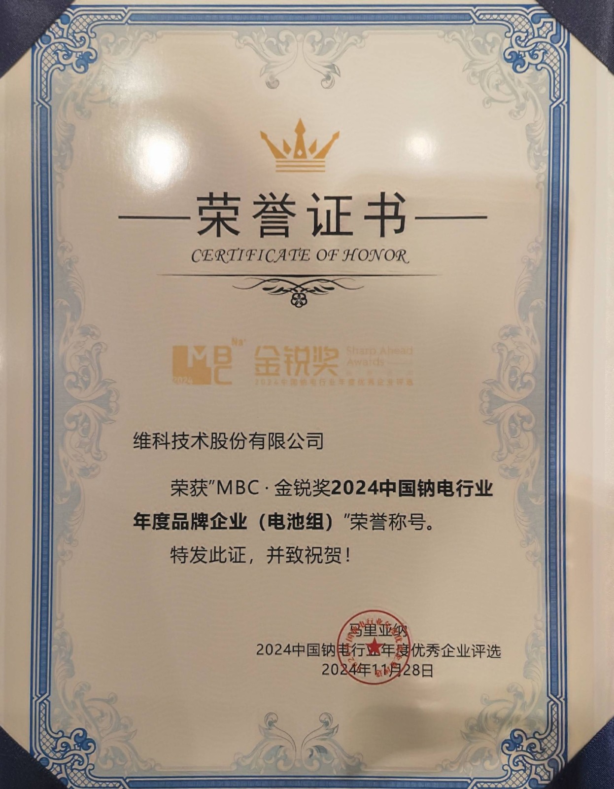 “MBC · 金銳獎”旨在表彰對中國鈉離子電池產業商業化進程和可持續發展做出突出貢獻的企業,遴選出具有公信力的優秀品牌、技術和產品。維科技術斬獲兩項重量級大獎,標志著公司在鈉電技術創新、產品開發制造以及市場應用推廣的全方位突破,更是對其未來發展潛力的肯定和期許。