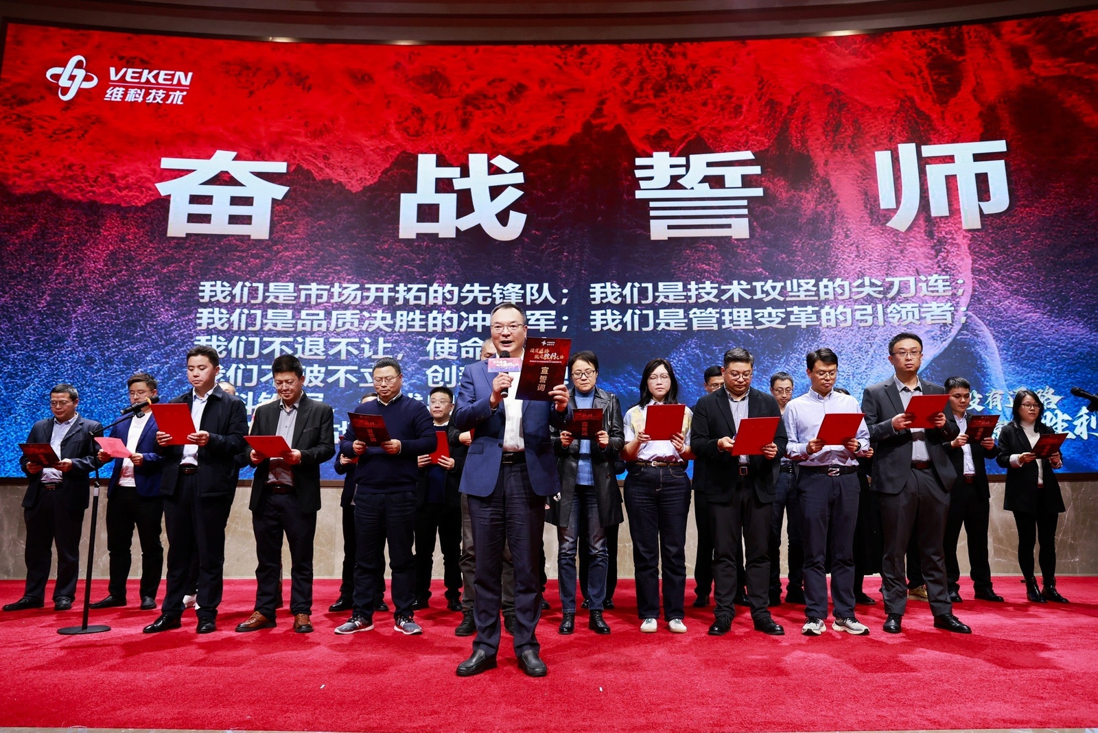 緊接著,在陳董事長的帶領下,股份公司領導班子與新聘主要干部集體肅立,高舉右拳,進行奮戰宣誓。臺下全員肅然起立,齊聲跟誦,激昂有力的誓言如雷回蕩,匯聚成維科人決勝2026的鋼鐵意志與集體信念。